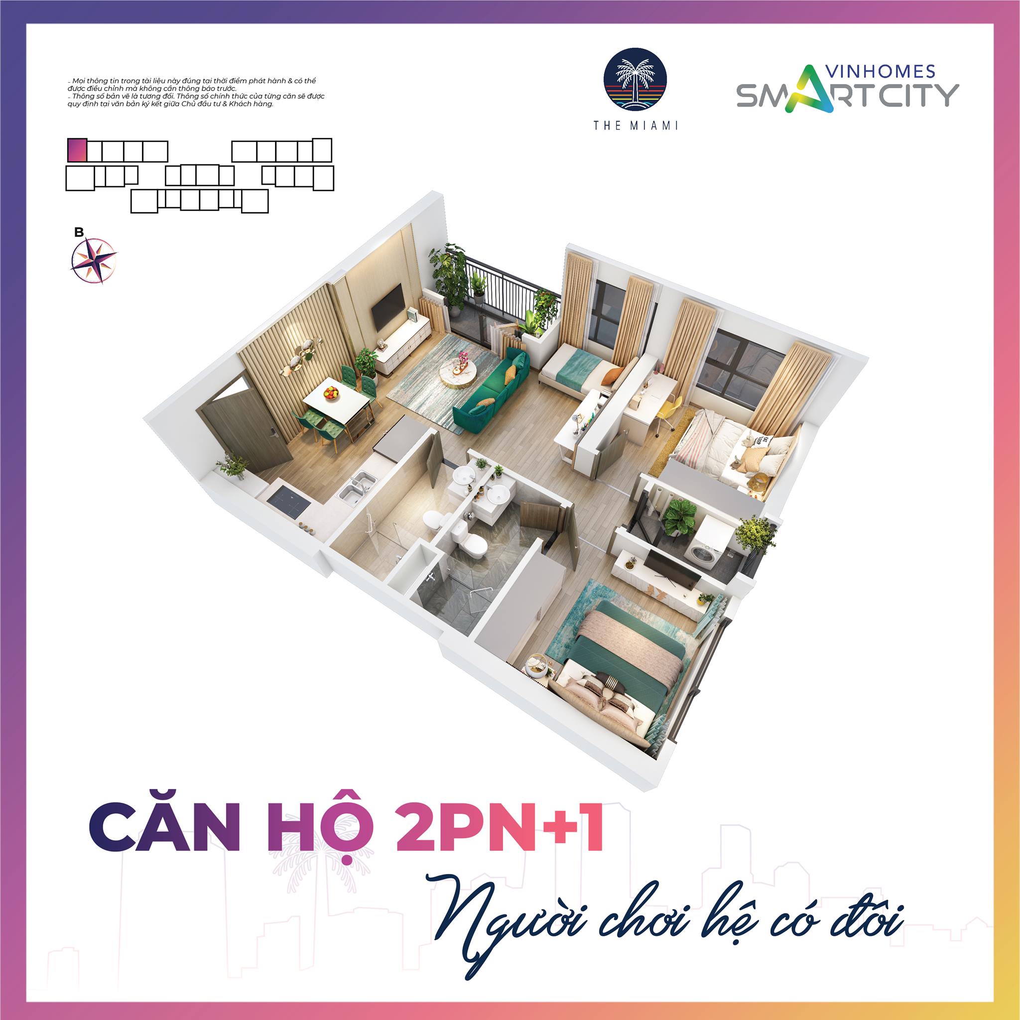 Người chơi hệ có đôi: Căn hộ 2PN (54.0m2 – 61.7m2) hoặc 2PN+1 (63.4m2 – 64.2m2)
