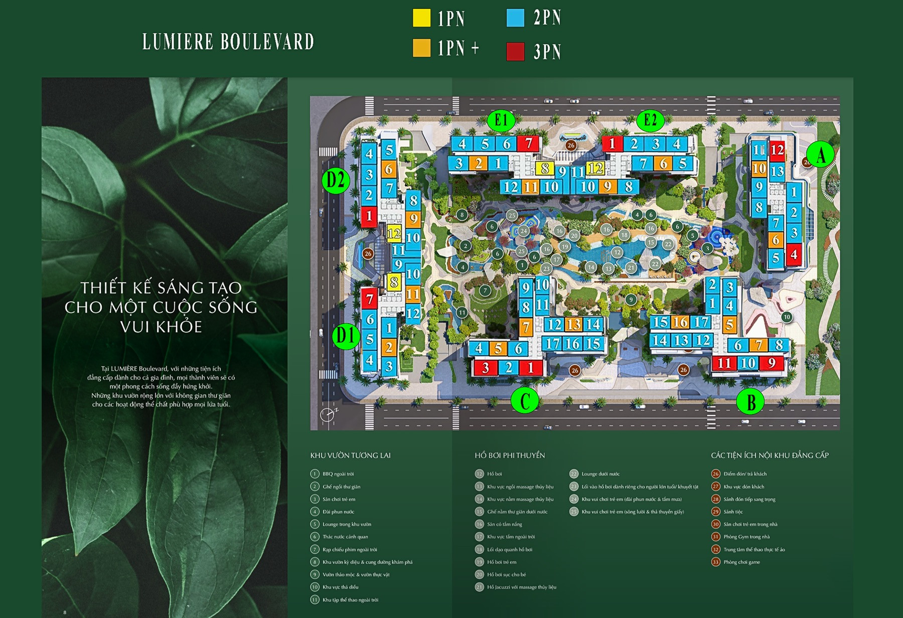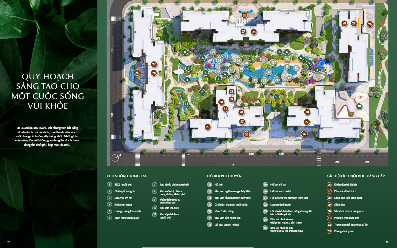 Lumiere Boulevard mang đến đặc quyền dành cho cư dân với chuỗi tiện ích được thiết kế chỉnh chu và mang phong cách nghỉ dưỡng tại gia, mang đến không gian sống xanh gần gũi thiên nhiên và đủ đầy các tiện ích mua sắm, giải trí… cùng cộng đồng dân cư văn minh hiện đại.
