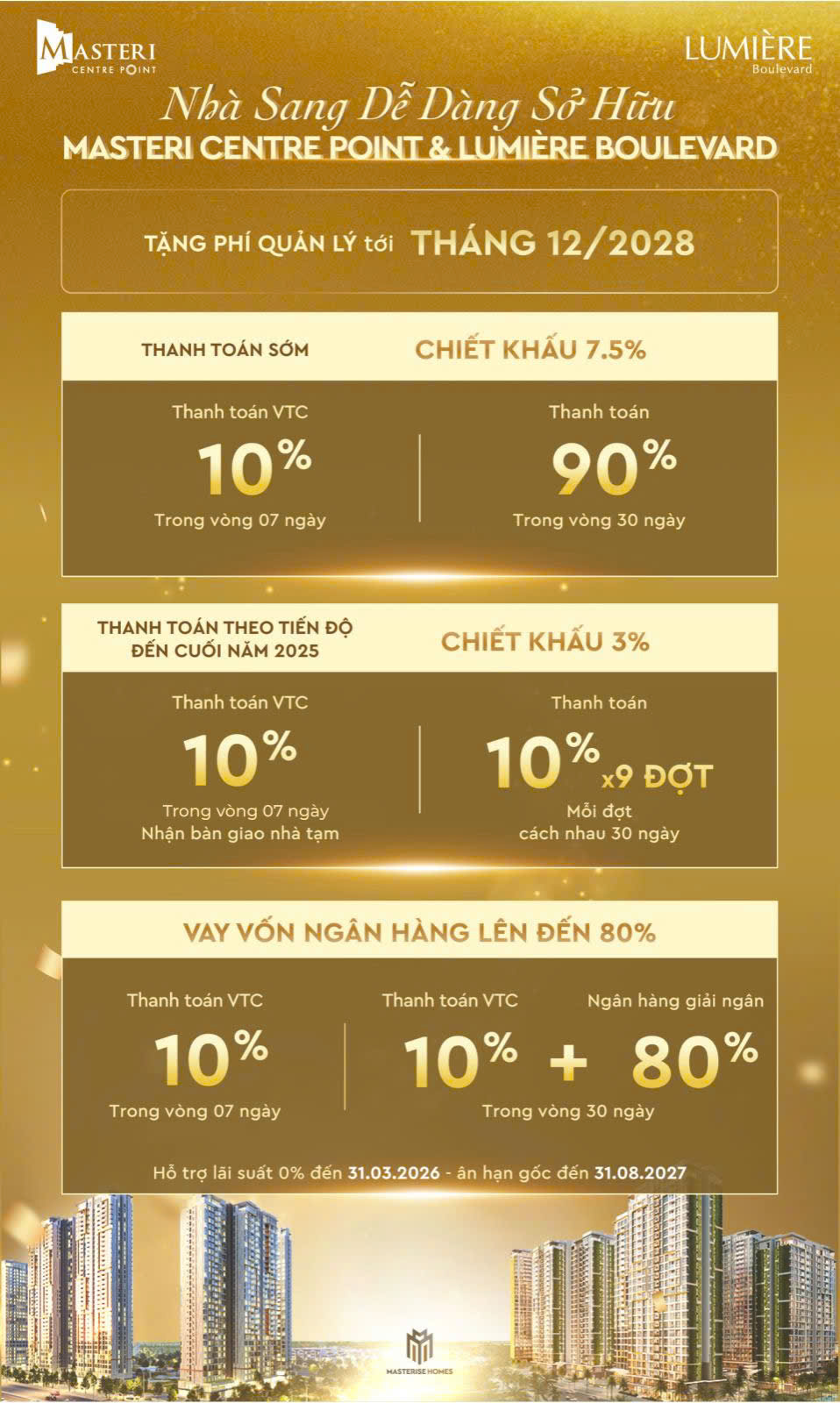 Sở hữu vị trí trung tâm, đẹp nhất Đại đô thị Grand Park, Masteri Centre Point mang đến tiện nghi kết nối hoàn hảo và hệ tiện ích trọn vẹn cho cộng đồng cư dân. Hiện thực hóa không gian sống sang trọng với chất lượng chuẩn quốc tế, tiện ích sống đẳng cấp và dịch vụ quản lý vượt trội từ Masterise Property Management, Masteri Centre Point đã bàn giao và chào đón cộng đồng cư dân văn minh bậc nhất, tận hưởng chuẩn sống sướng mỗi ngày tại tọa độ kim cương.