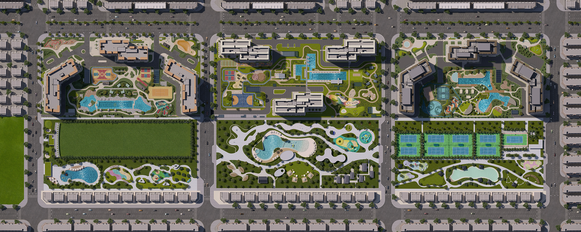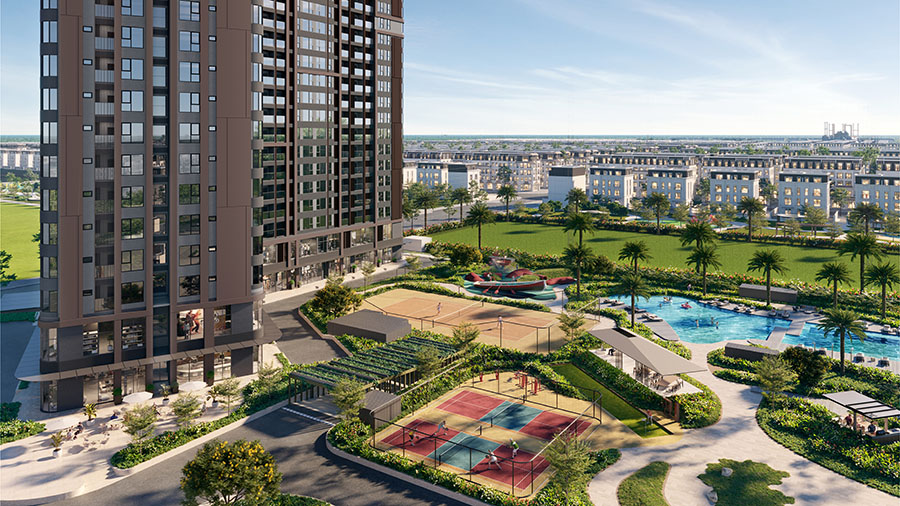 Hồ điều hòa, công viên chủ đề và khu thể thao đa năng giúp cư dân tận hưởng trọn vẹn không gian xanh – vận động – thư giãn mỗi ngày.