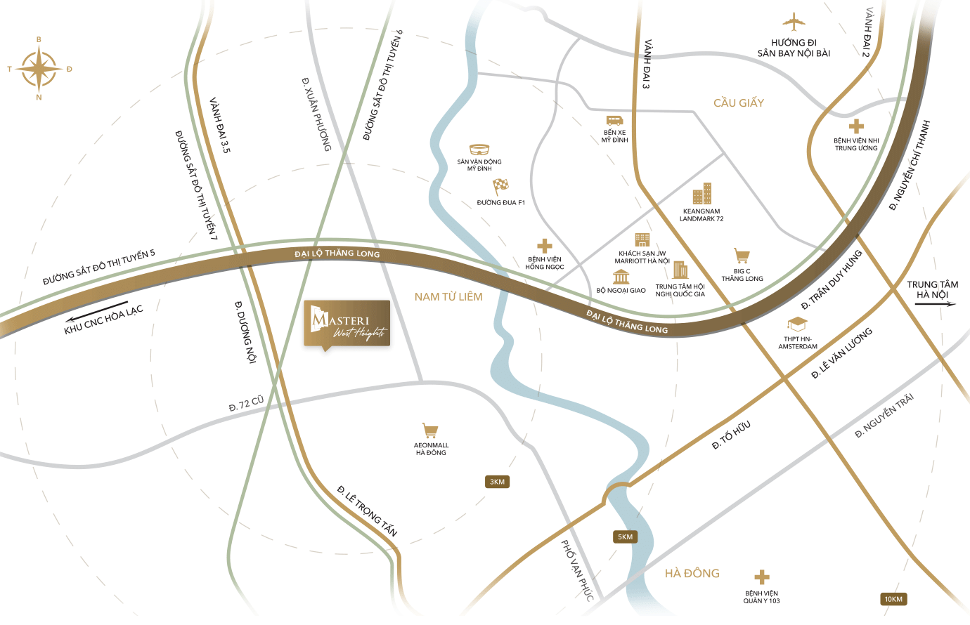 Masteri West Heights sở hữu vị trí kim cương tại vùng lõi của đại đô thị đáng sống bậc nhất Thủ đô – Smart City, ôm trọn hồ trung tâm 4,8ha cùng tầm nhìn thoáng đãng hướng 3 công viên liên hoàn rộng lớn. Được thiết kế bởi những đối tác nổi tiếng thế giới, Masteri West Heights kiến tạo chuẩn mực sống quốc tế đậm chất wellness với hệ tiện ích đa tầng độc đáo, gồm 22 tiện ích đặc quyền, 29 tiện ích của công viên nội khu cùng thiết bị bàn giao cao cấp từ những thương hiệu hàng đầu như Kohler (Mỹ), Häfele (Đức), Daikin (Nhật Bản).