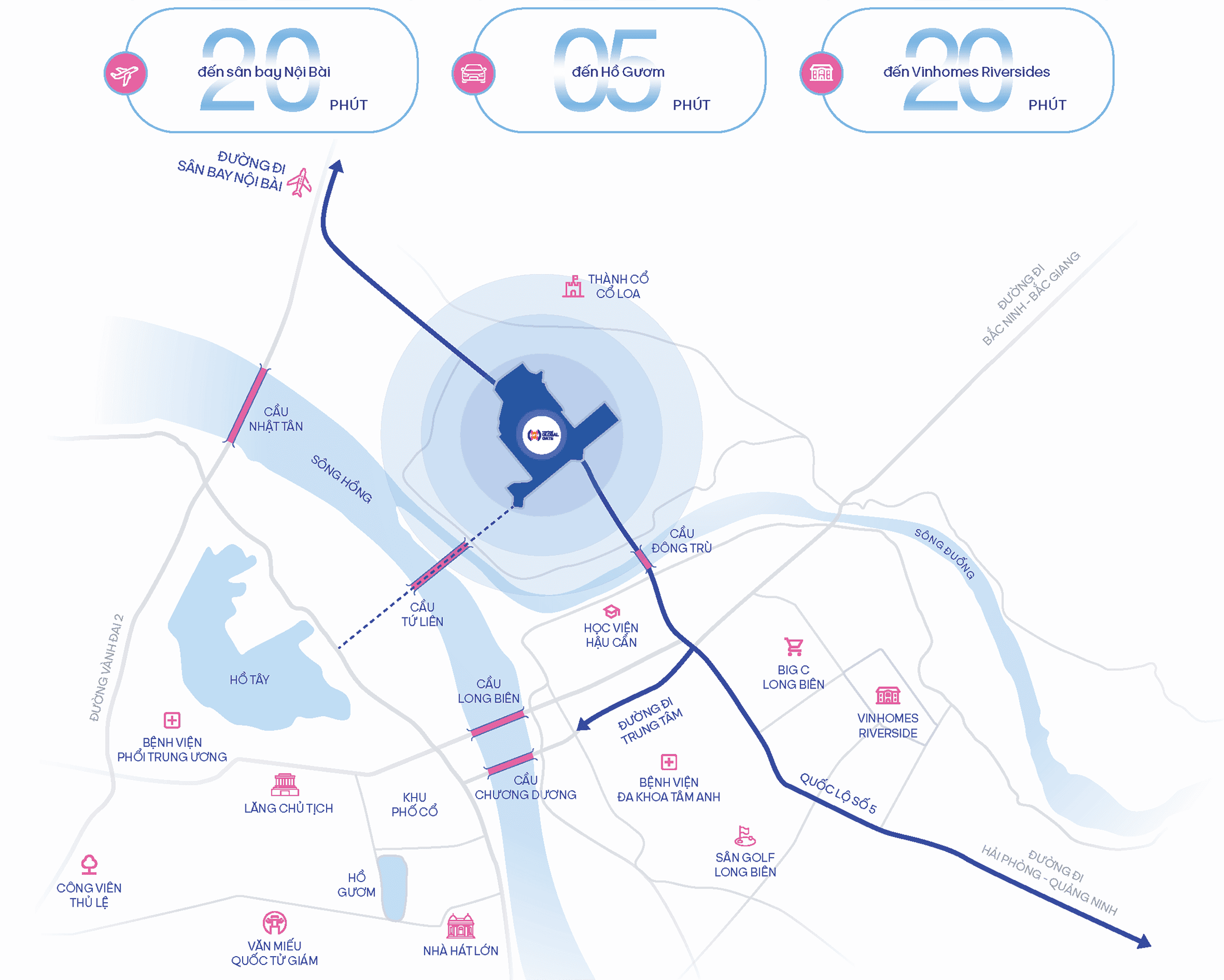 Vinhomes Global Gate sở hữu hệ thống giao thông thuận tiện, cho phép cư dân di chuyển nhanh chóng đến các điểm quan trọng trong thành phố: