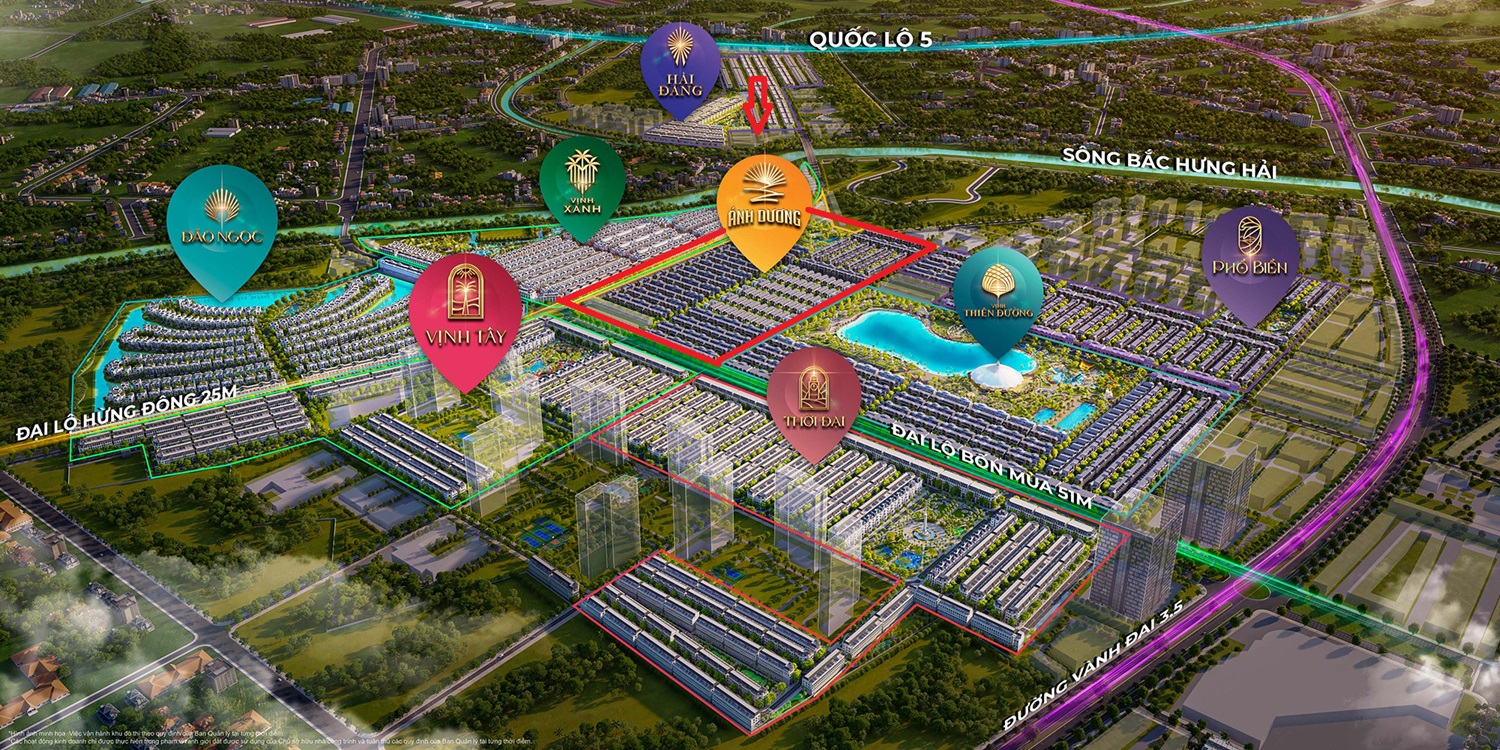 - Quy mô phát triển: 8 phân khu với khoảng 8.458 căn nhà ở thấp tầng (biệt thự, liền kề, shophouse) và 10 tòa căn hộ chung cư.