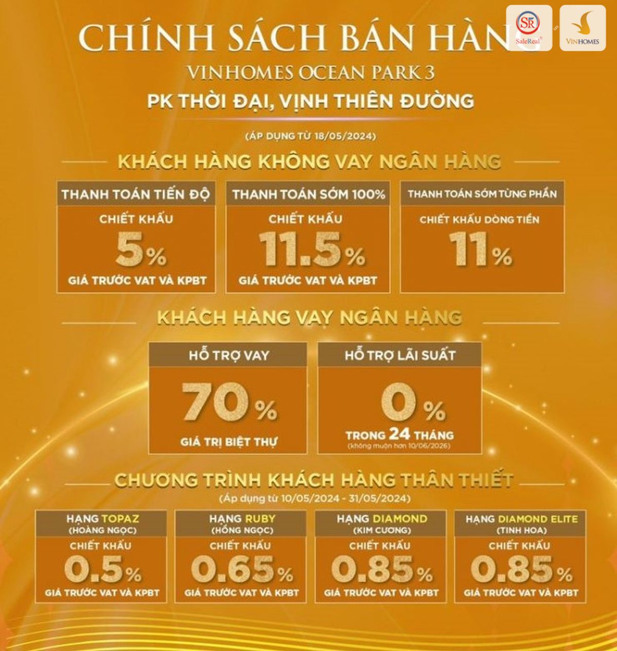 - Hỗ trợ vay vốn ngân hàng: Khách hàng có thể được vay tới 70% giá trị sản phẩm, với các điều khoản ưu đãi như lãi suất 0% trong một khoảng thời gian nhất định (thường từ 24 đến 36 tháng).